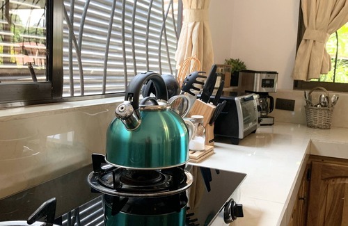 Perfect for culinary enthusiasts! Turn fresh finds from the local farmers' market into delicious meals. The kitchen includes a 2-burner gas stove, coffee maker (for the best coffee in the world), blender for tropical smoothies, fridge with freezer, pots, pans, plates, cups, utensils, and essentials like salt, pepper, coffee, sugar, and oil.