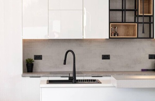 The property is enclosed by a fence, ensuring full privacy. The sleek entrance opens to the kitchen, dining, and living room areas. The contemporary Euro-design kitchen features full-size appliances, a wine fridge, and all necessary kitchenware for a home dining experience. The kitchen island seats four guests at the breakfast bar, while the dining table accommodates eight.