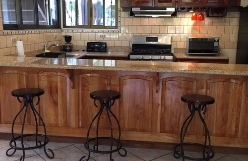 The house has two bedrooms, one bedroom has three queen size beds with private bad. The second bedroom is equipped with one full bed and two single beds...Bathroom and shower are located off the hallway. with living room and full Kitchen. The pool is very nice and the best to be in the tropical heat. There is a BBQ grill and full open kitchen air ceiling fans. The night time with the lighting is very special. There is air conditions units, hot water,cable tv, wi-fi, kitchen and garage if needed. Location of the home is five from the bay of Golfito. Well appointed with granite counter tops. Located just 100 meters away is Casa Roland Marine resort hotel with bars, restaurants, tennis court,bar and rent a car. Maid service if you want for $25 extra cost per day.