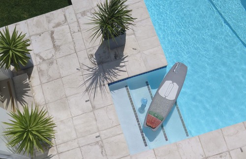 Modern 7 bedroom / 7 bathroom / 16 bed villa with views of Table Mountain. Borehole water supplied. House-scale battery backup to mains power (load-shedding resilient). Located in the village of Big Bay, just 100 metres from the beach, the spacious Club-style house has all the conveniences needed for a relaxing stay including: large well-equipped kitchen (chefs will love the inventory); swimming pool; fast fibre internet; games room with pool table; braai/barbecue room; TV with satellite sports service; laundry room; and should you need it loads of storage for sports gear.