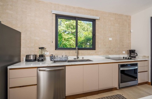With its tropical vibes and being just steps away from the ocean, it’s a dream come true! The open living and dining area creates a perfect space for relaxation and entertaining guests. There are two Primary suites with king beds, and a third bedroom is a private suite with a queen bed. All bedrooms have access to an outdoor patio. The swimming pool is a fantastic for those hot Costa Rican days!