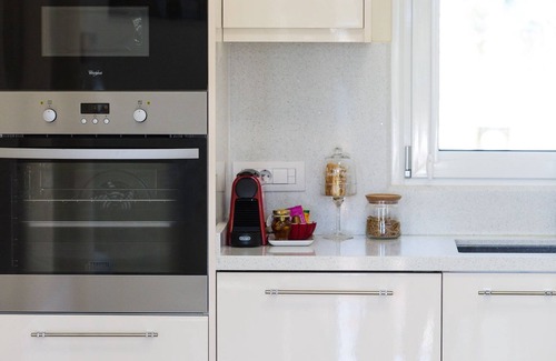 The second area provides an additional living room with an indoor dining area and a fully equipped kitchen on the ground floor. The living room opens up to the lawn-covered terrace, where guests can find an additional outdoor dining table and sitting area. One bedroom, also offering outdoor access, as well as a bathroom with a shower cabin can also be found on the ground level. On the first floor the two remaining bedrooms are located, both offering access to a spacious balcony overlooking the sea and the garden. Finally, a family bathroom with a shower cabin is also available. All bedrooms are air-conditioned and equipped with 32 TVs. Three of the bedrooms feature a double each (1,60 X 2,00 cm), while the other three are equipped with two single beds each (0,90 X 2,00 cm), which can be joined together to form a king-sized bed (1,80 X 2,00 cm) if you wish.