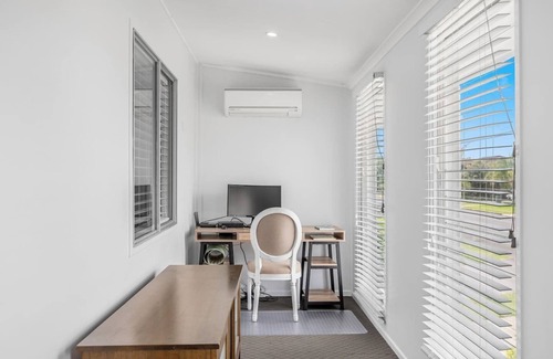 From the upper level, views of the ocean and neighbourhood create a lovely backdrop to your stay. Full-length glass bathes the space in beautiful natural light and creates an airy, spacious feel. The full kitchen is designed around an island, equipped with sophisticated appliances to whip up a feast at home. Come together around the dining table or take things downstairs into the garden. The living area opens to a front balcony and is a comfortable space to unwind in front of the smart TV with air-conditioning to keep things cool. This flows through to a dedicated office, fit with a desk and chair for those working from home.