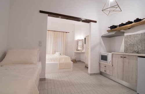 An open-faced kitchenette provides all the essentials for a short-term stay in Paleochora.