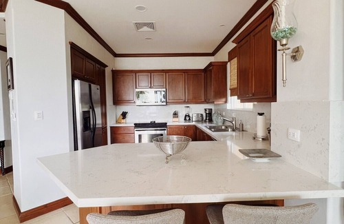Roomy 2000 sqft oceanfront 3 bed/2 bath condo in Los Suenos Resort overlooking Herradura Bay accommodating 8 guest with elevator access. Elegant views of Herradura Bay and Los Suenos marina from a large wrap-around terrace, the living area and master bedroom. Stunning sunset views and close encounters with exotic wildlife.