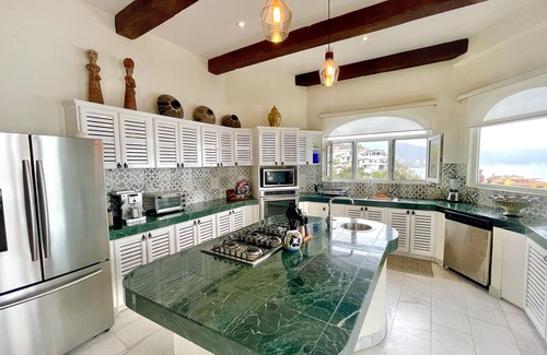 Villa Jazmin boasts unique architecture featuring marble, cantera, brick cupolas, stained glass, original Mexican art and numerous terraces that showcase the expansive bay, mountain and cobblestone vistas.
