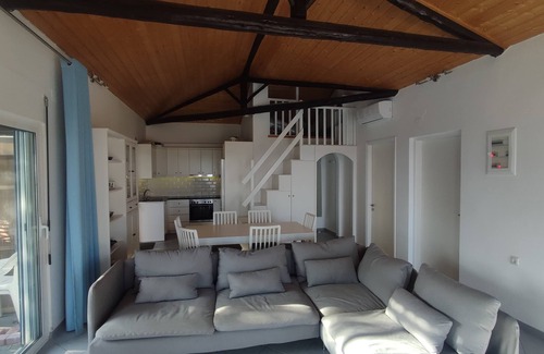 The cliff-top villa which, togther with the adjoining studio, sleeps six adults is on a small headland so has 180° sea views. There are five secluded coves within a few minutes walk, with the vast sandy and organised beaches of Psilli Amos and Votsalakia only a 20 minute stroll away.