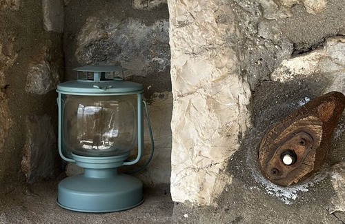 The interior extends to 3 levels. In the first, there are two bedrooms and a bathroom with shower. Natural rocks protrude from the walls.