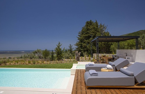 Nestled in a charismatic location 4km just off the coast of Lefkada island on the outskirts of Peratia, a traditional coastal hillside village, overlooking the mesmarising coastline of Lefkada and Lefkada town, this majestic property and its location puts a different perspective on the Lefkada holiday experience. Panoramic sea views with pristine crystal water, beautiful Lefkada Skyline and impressive mountain relief, together with a spectacular sunset view. This retreat across Lefkada Island is a real gem for nature lovers, full of fascinating colors, aromas, olive groves and pine trees that all blend into the blue of the Ionian sea.