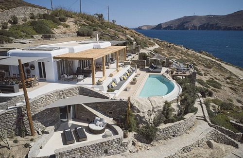 Gracefully perched on the hillside of the bay, Villa Barbarossa is an engaging beachfront property that offers an idyllic retreat right on the golden sandy shores of Ftelia beach in Mykonos. With 7 beautifully designed en-suite bedrooms, the property comfortably accommodates up to 14 guests and provides a serene and luxurious setting with unobstructed sea views that stretch across the crystal-clear Aegean waters. Embodying traditional Mykonian architecture, the property features a tasteful mix of stone and concrete, paired with warm, welcoming decor. The interiors are thoughtfully designed to create a cozy yet luxurious atmosphere, perfect for unwinding with family or friends. Outdoor living is equally impressive, with multiple lounge areas which are spread across the expansive terrace and allow guests to soak in the stunning surroundings. At the same time, the BBQ and dining area offer the perfect setting for alfresco meals with a view. Last but not least, for those who wish to stay active during their stay, an outdoor gym area provides a great space to work out while enjoying the spectacular sea vistas. The property comes with daily continental breakfast and is protected for security purposes only by exterior security cameras which point to its peripheral areas.