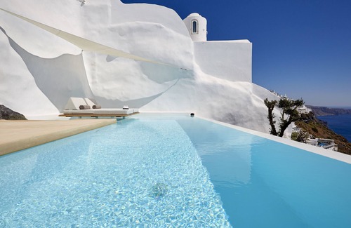 The villa Etheras true to her name, compiles key aesthetic principles such as a spacious living room, two bedrooms with ensuite bathrooms, and a fully-equipped kitchen while it can host up to four guests. Villa Etheras hangs imposingly from the rocks where its exterior spreads over 130 sq.m. The villa's private surrounding patio offers plenty of luxurious touches like an infinity private heated swimming pool, outdoor dining area, pool and off-pool loungers , all complementing the perfect relaxation canvas. Enjoy the warmth of Santorini's sun as you admire the breathtaking panoramic views of the caldera.